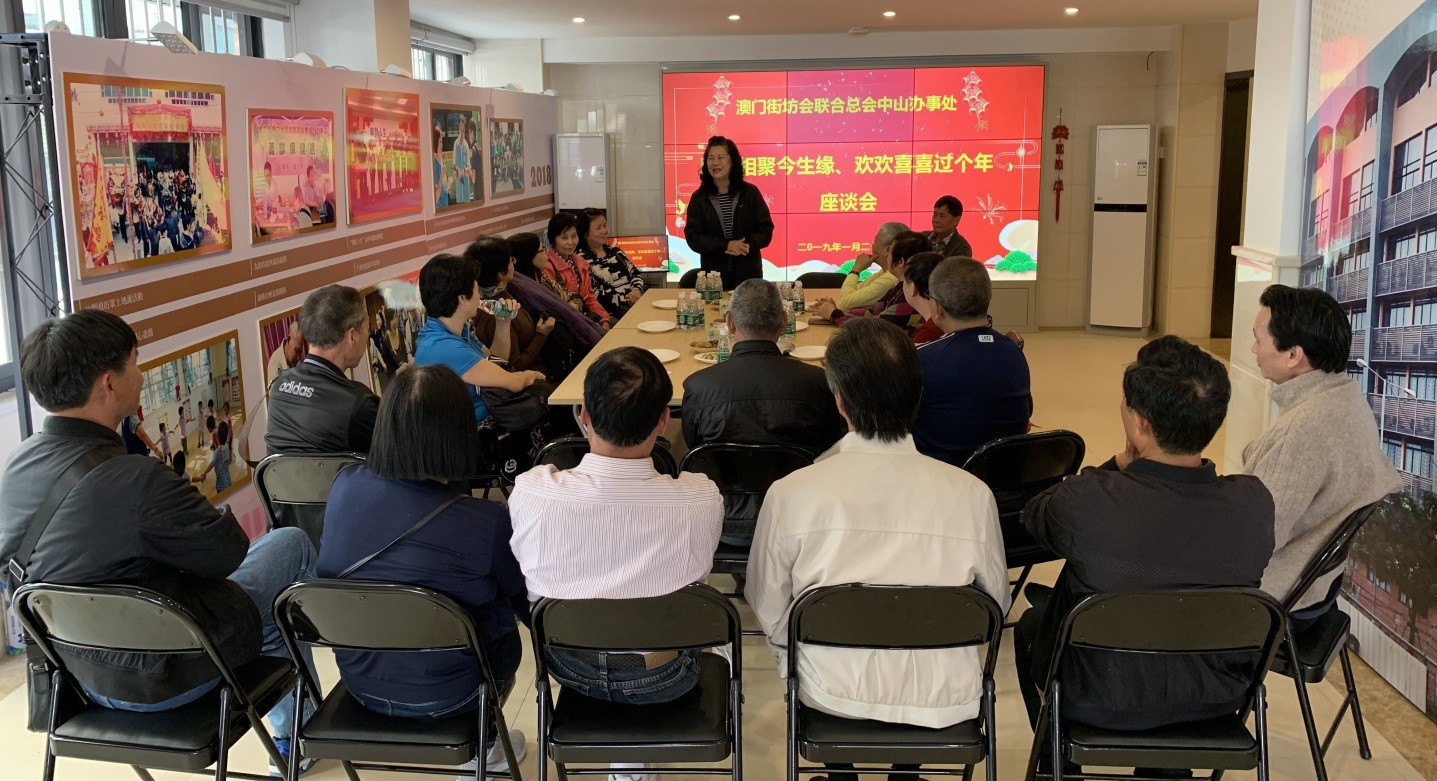 日前澳門街坊會聯合總會中山辦事處舉辦了“同仁相聚今生緣,歡歡喜喜過個年”迎新座談會,街坊總會副會長羅德明與二十多名澳門街坊歡聚一堂,喜迎新春佳節。