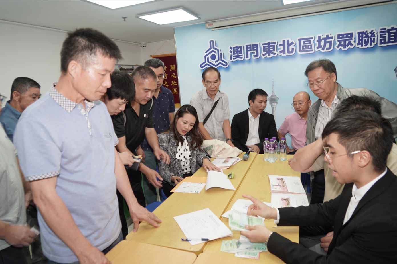 澳門日報讀者公益基金會副會長陸波,副理事長許建章、崔家榮、梁永佳,監事長吳柱邦,理事鄺鍵濠、鄭嘉麟、關振隆、李家賢,昨日下午三時前往東北坊會,向受災住戶發放緊急援助款項。街坊總會副理事長陳家良,東北坊會副理事長黃鏡陽、吳銳紅、梁彥邦,街坊總會北區辦事處副主任林淑貞、黑沙環社區服務中心副主任伍玉環等出席。