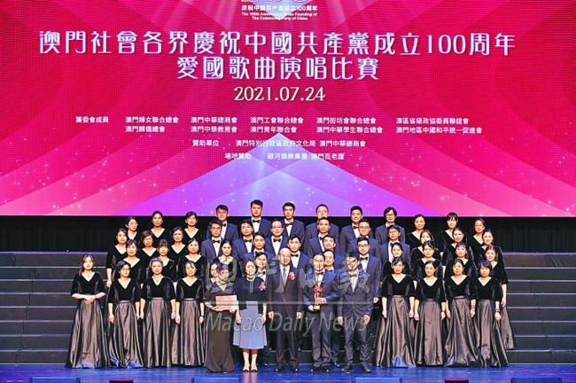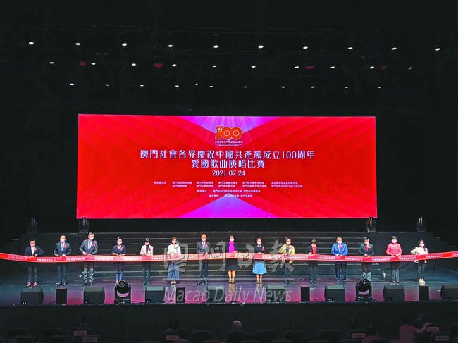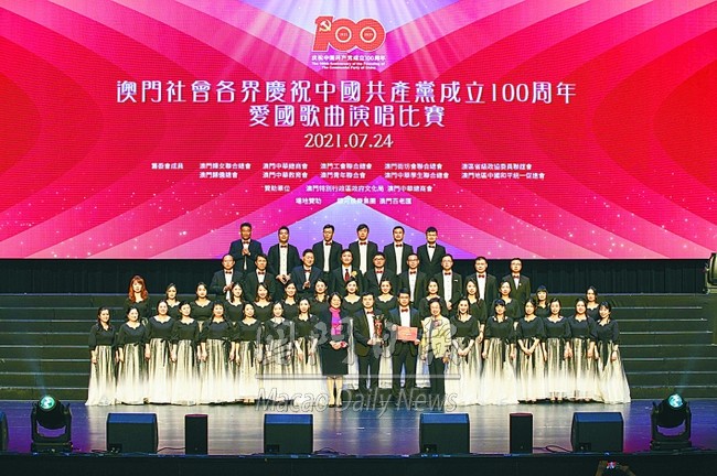 澳門社會各界慶祝中國共產黨成立一百周年活動籌委會昨舉行“愛國歌曲演唱比賽”,來自社團、學校及機構等三十支隊伍參賽,以嘹亮悅耳歌聲表達愛國情懷。婦聯總會會長賀定一表示,透過比賽向黨的百年華誕獻禮,為澳門帶來正能量。澳門社會各界將繼續高舉愛國愛澳旗幟,凝聚澳門愛國愛澳力量。