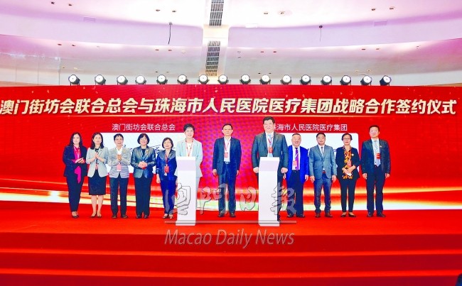 第三屆中國老年健康國際論壇昨在珠海開幕,澳門街坊總會與珠海市人民醫院醫療集團在分論壇簽署戰略合作協議,共同搭建“澳珠合作”新模式和灣區老年健康合作交流平台,為“澳門新街坊”等居珠海和橫琴的本澳居民提供全面優質的健康管理與醫療服務,在兩地居民醫療服務方面展開深入的合作。